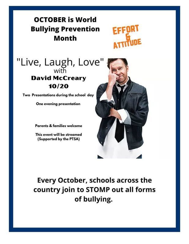 To encourage Unity and to support all the efforts made across the country to STOMP out bullying, the Dover Middle/High School, with support from the PTSA, has invited David McCreary, motivational speaker, comedian, and magician to speak to our students about creating a better life for ourselves and for our community. His program is titled, "Live, Laugh, Love," and is designed to encourage students and families to become the best version of themselves. David asserts that to LIVE MORE and to get the most out of life we should follow three simple steps: Learn more, Laugh more, Love more as we go about our daily lives.